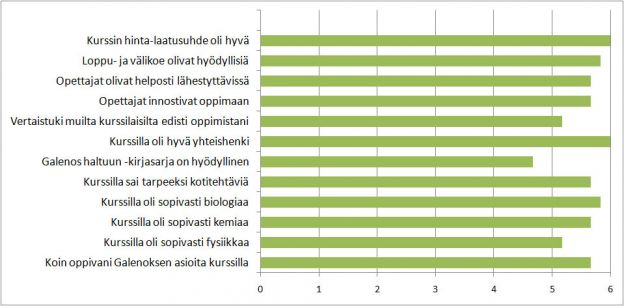 Kuva 2: Asteikkona käytettiin 1=täysin eri mieltä, 3=en osaa sanoa ja 6=täysin samaa mieltä. Kurssin hinta-laatusuhde sai arvosanaksi 6/6 kuten myös kurssin kurssilla vallinnut yhteishenki. Kurssilla käytetty Galenos haltuun -kirjasarja sai hieman heikompia arvosanoja kuin kurssi muutoin. Ensi kevään kurssilla käytämme uusia oppimateriaaleja mm. Galenoksen poistumisen vuoksi.