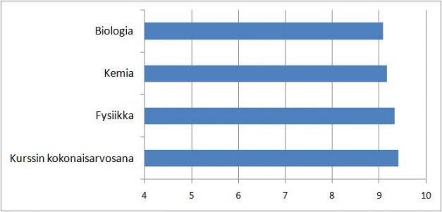 Kuva 1: Opetuksen arvosanan keskiarvo oppiainekohtaisesti ja kurssin kokonaisarvosana. Kokonaisuus on parempi kuin osiensa summa!